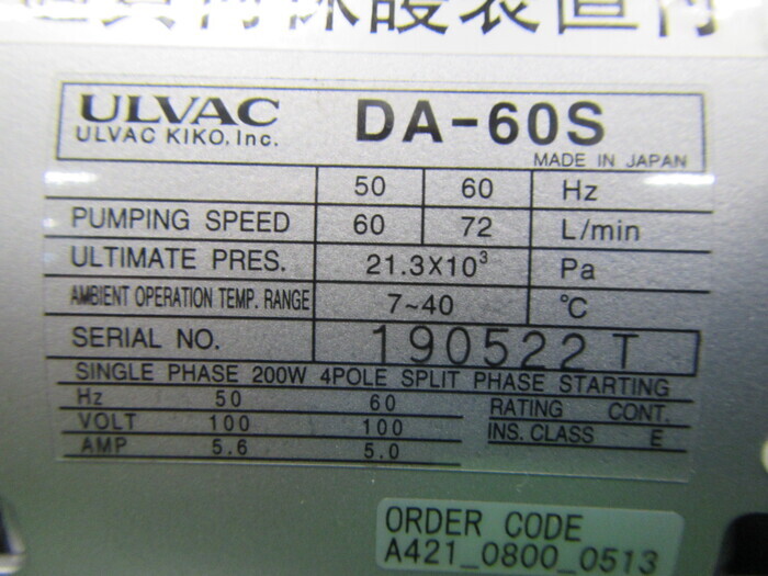 ポンプ 真空ポンプ ダイアフラムポンプ ダイアフラム真空ポンプ メーカーアルバック 型式DA-60S 年式 外寸 展示場塩山テクニカルセンター 価格42,900円(税込) ASK管理No.P70227 在庫確認・お問合せ 機械仕様排気速度:60/72L/min 到達圧力:21.3x10^3Pa 電源:AC100V 50/60Hz 添付ファイル 動作チェックシート ※ 以下の画像をクリックをすると拡大します