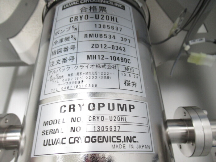 ポンプ 真空ポンプ クライオポンプ クライオポンプ メーカーアルバック 型式CRYO-U20HL 年式 外寸 展示場九州テクニカルセンター 価格お問合せください ASK管理No.P70355 在庫確認・お問合せ 機械仕様 添付ファイル ※ 以下の画像をクリックをすると拡大します